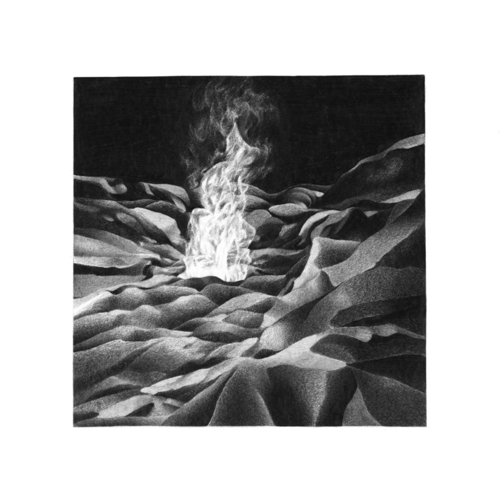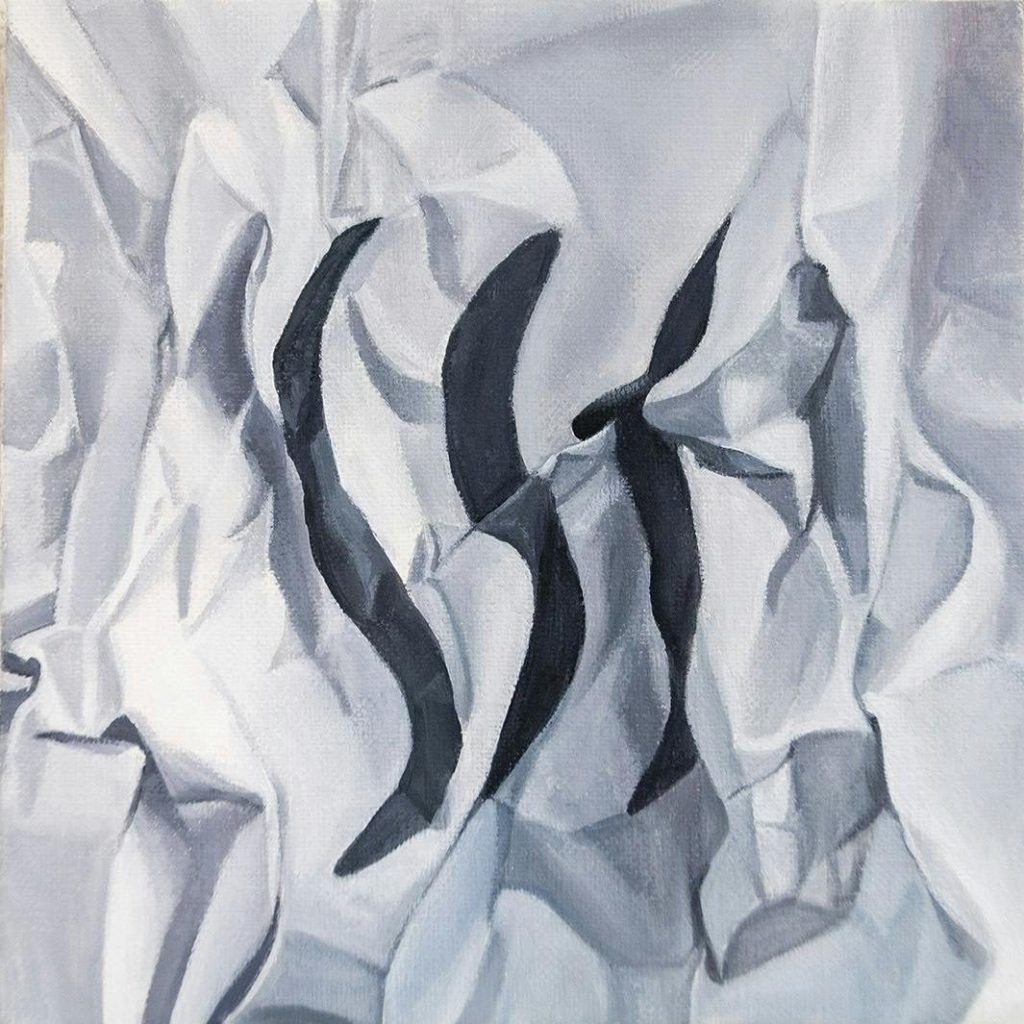 自己のやどる身体が - 今ここにあるもの - として認識することは、わたしを纏う衣や気温、 傷、いずれも接触を感知することでようやく保たれる微細なイメージからなるものだと考えています。イメージを奥へ奥へと擦り付けても、画布の繊維の隙間からは現実の光やパネルのダメージがこちらを見ています。接触から生成されるイメージと、キャンバスの僅かなシミや傷といったダメージを往来し、頼りないイメージがかたちを保つ/崩れる揺らぎを制作しています。