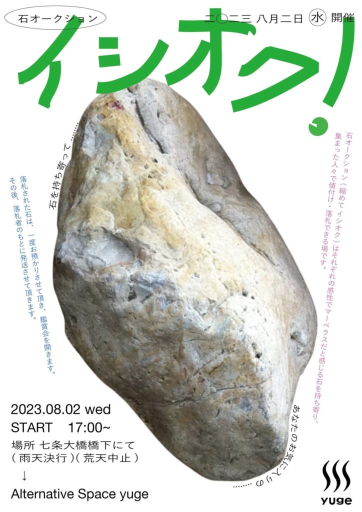 石オークション(縮めてイシオク)は、それぞれの感性でマーベラスだと感じる石を持ち寄り、集まった人々で値付け、落札できる場です。 落札された石は、一度お預かりさせて頂き、展覧会を開きます。 その後、落札者のもとに発送させて頂きます。