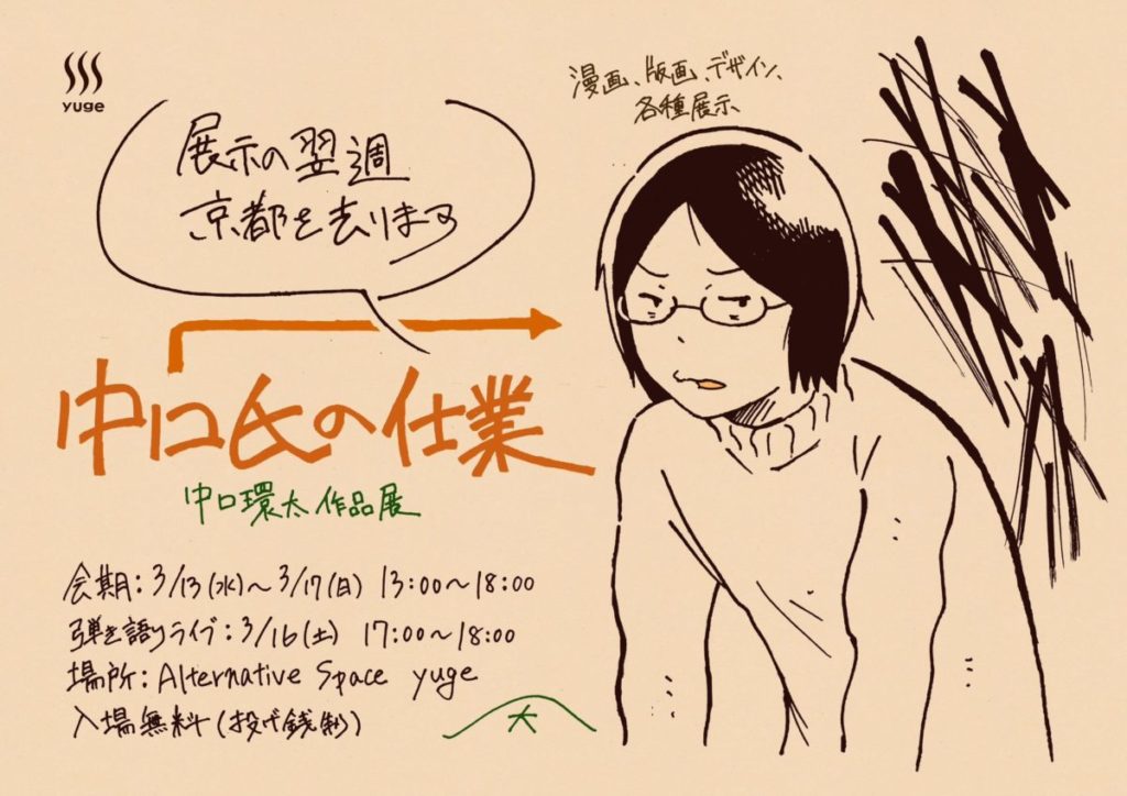 彼の京都での生活が一区切りつく中で、彼のこれまでのアートワークや原稿を展示いたします。勿論ライブもありますのでぜひお越しください。版画家、漫画家、音楽家など多くの顔で活動を続けてきた中口環太の個展/弾き語りライブをyugeにて開催します。