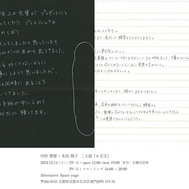 yugeでは12/14~12/29まで川村摩那と木田陽子の二人展を行います。今回の二人展に向けて川村と木田は約半年間に渡って手紙の交換を続けてきました。本展示は、お互いの手紙の文章から着想を得たものとなっております。